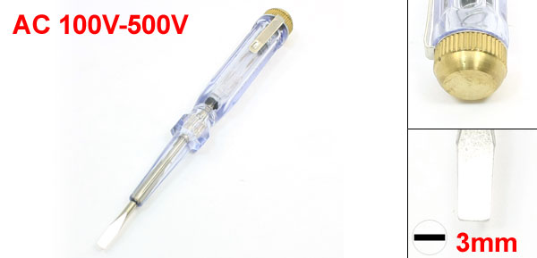 Product Name Electroprobe Voltage AC 100V-500V Casing Material Plastic Slot Bit Size 3mm Size(Approx) 13 x 1.5cm / 5.1" x 0.6"(L*D) Color Clear Baby Blue, Silver Tone Weight 12g Package Included 1 x Electroprobe - Reviews