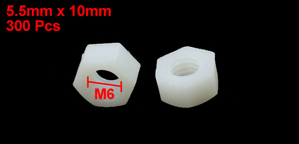Product Name Hexagonal Threaded Spacer Thread Size M6 Total Size 5.5 x 10mm / 0.22" x 0.4" (H*D) Material Nylon Color White Net Weight 106g Package Content 300 Pcs (±2%) x Hexagonal Threaded Spacer  - Reviews