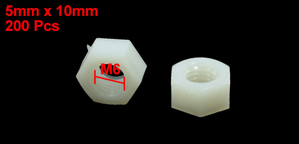 Product Name Hexagonal Threaded Spacer Thread Size M6 Total Size 5 x 10mm / 0.2" x 0.4" (H*D) Material Nylon Color White Net Weight 72g Package Content 200 Pcs (±2%) x Hexagonal Threaded Spacer - Reviews