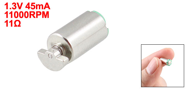 DetailsRepairing Part 1.3V 45mA 11000RPM 11 Ohm DC Mini Vibration Motor  Product Name DC Vibration Motor Working Voltage DC 1.1-1.6V Rated Voltage DC 1.3V Start Voltage DC 1.0V Rated Current 45mA Stall Current 105mA Rated Speed 11000±1500RPM Resistance 11Ohm Body Size 12.7 x 6mm/ 0.5" x 0.24"(L*D) Main Color Silver Tone Main Material Metal Weight 3g Package 1 x DC Vibration Motor