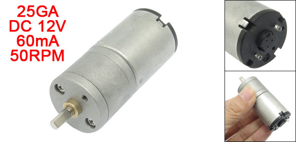 Product Name DC Geared Motor Model Type 25GA Rated Voltage DC 12V Current 60mA Speed 50RPM Shaft Size 4 x 10mm/ 0.16" x 0.39" (D*H) Total Size 25 x 68mm / 0.98" x 2.7" (Max.D*H) Main Color Silver Tone Main Material Metal Weight 89g Package 1 x DC Geared Motor - Reviews