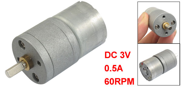 Product Name DC Geared Motor Model Type 25GA Rated Voltage DC 3V Current 0.5A Speed 60RPM Shaft Size 4 x 12mm/ 0.16" x 0.5"(D*H) Body Size 25 x 41mm / 0.9"x 1.6"(Max.D*H) Total Length 53mm / 2.1" Main Color Silver Tone Main Material Metal Weight 70g Package 1 x DC Geared Motor - Reviews