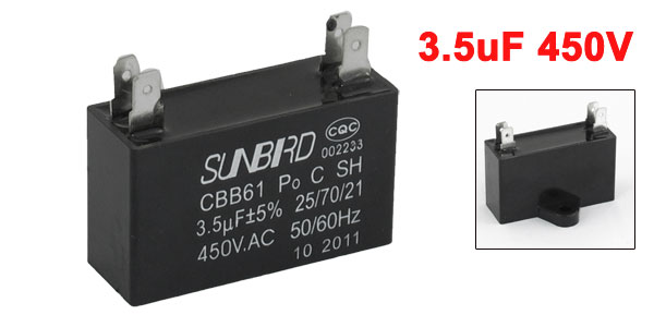 Product Name Motor Run Capacitor Model CBB61 Material Polypropylene Film Rated Capacitance 3.5uF Tolerance ±5% Rated Frequency 50/60 Hz Rated Voltage 450V AC Overall Size 4.8 x 2.9 x 3.9cm/ 1.9" x 1.1" x 1.5"(L*W*H) Mount Hole Dia 5mm/ 0.2" Pin Size 9 x 6mm/ 0.35" x 0.24"(L*W) Pin Spacing 33 x 5mm/ 1.3" x 0.2"(L*W) Main Color Black Net Weight 32g Package Content 1 x Motor Run Capacitor - Reviews