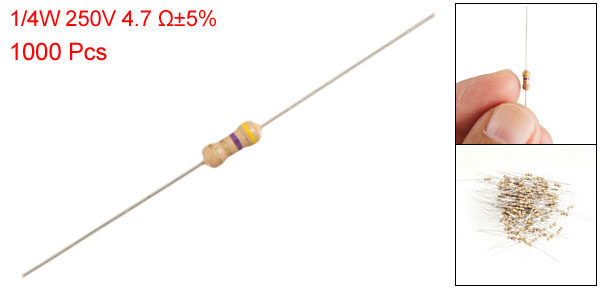 Product Name Carbon Film Resistors Material Type Carbon Film Quantity 1000 Pcs (± 2%) Rated Power 1/4 W Resistance Value 4.7 Ω Tolerance ± 5% Withstang Voltage 250V Body Size (Approx.) 5 x 2mm/0.2'' x 0.08'' (L*D) Lead Size (Each End) 20 x 0.4mm / 0.8" x 0.016" (L*D) Total Length 45mm/1.8'' Color As Picture Shown Weight 100g Package Content 1000 Pcs (± 2%) x Carbon Film Resistors - Reviews