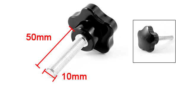 Product Name Star Knob Type Screw On Head Diameter 25mm / 0.98" Thread Length 50mm / 2" Male Thread Diameter 10mm / 0.39" Total Height 79mm / 3.1" Material Metal & Plastic Color Silver Tone & Black Weight 71g Package Content 1 x Star Knob - Reviews