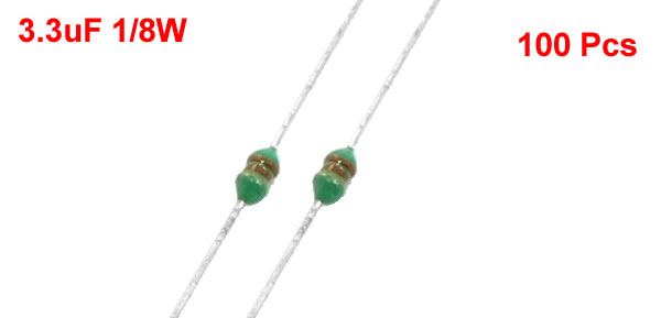 DetailsReplacement 3 Color Loop Axial Leads Fixed Inductors 3.3uF 1/8W 100 Pcs  Product Name Fixed Inductor Inductance 3.3uH Inductance Tolerance ±20% Power 1/8W Body Size 2.5mm x 5mm / 0.1" x 0.2"(Max.D*H) Leads Dia 0.5mm/ 0.0157" Total Length 60mm / 2.4" Material Coating Epoxy Resin Weight 13g Package Content 100(±2%) x Fixed Inductors