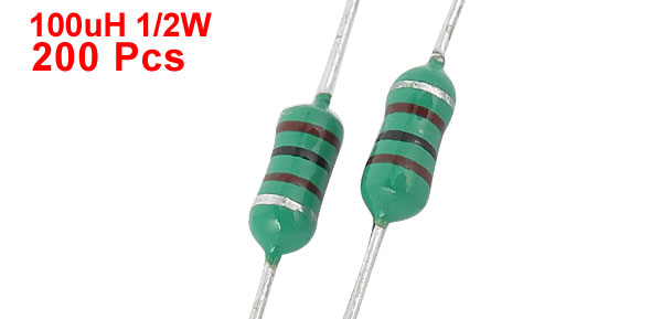 Product Name Fixed Inductor Inductance 100uH Inductance Tolerance ±10% Power 1/2W Body Size 3.2mm x 8mm / 0.13" x 0.31"(Max.D*H) Leads Dia 0.6mm/ 0.0124" Total Length 60mm / 2.4" Material Coating Epoxy Resin Weight 65g Package Content 200(±2%) x Fixed Inductors  - Reviews