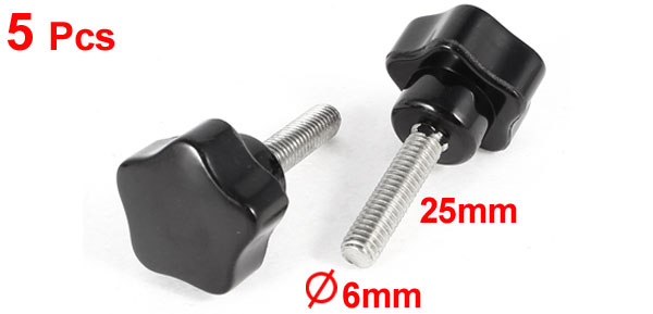 Product Name Star Knob Type Screw On Head Diameter 23mm / 0.9" Thread Length 25mm / 0.98" Male Thread Diameter 6mm / 0.24" Total Length 44mm / 1.7" Material Metal & Plastic Color Silver Tone & Black Weight 74g Package Content 5 x Star Knob - Reviews