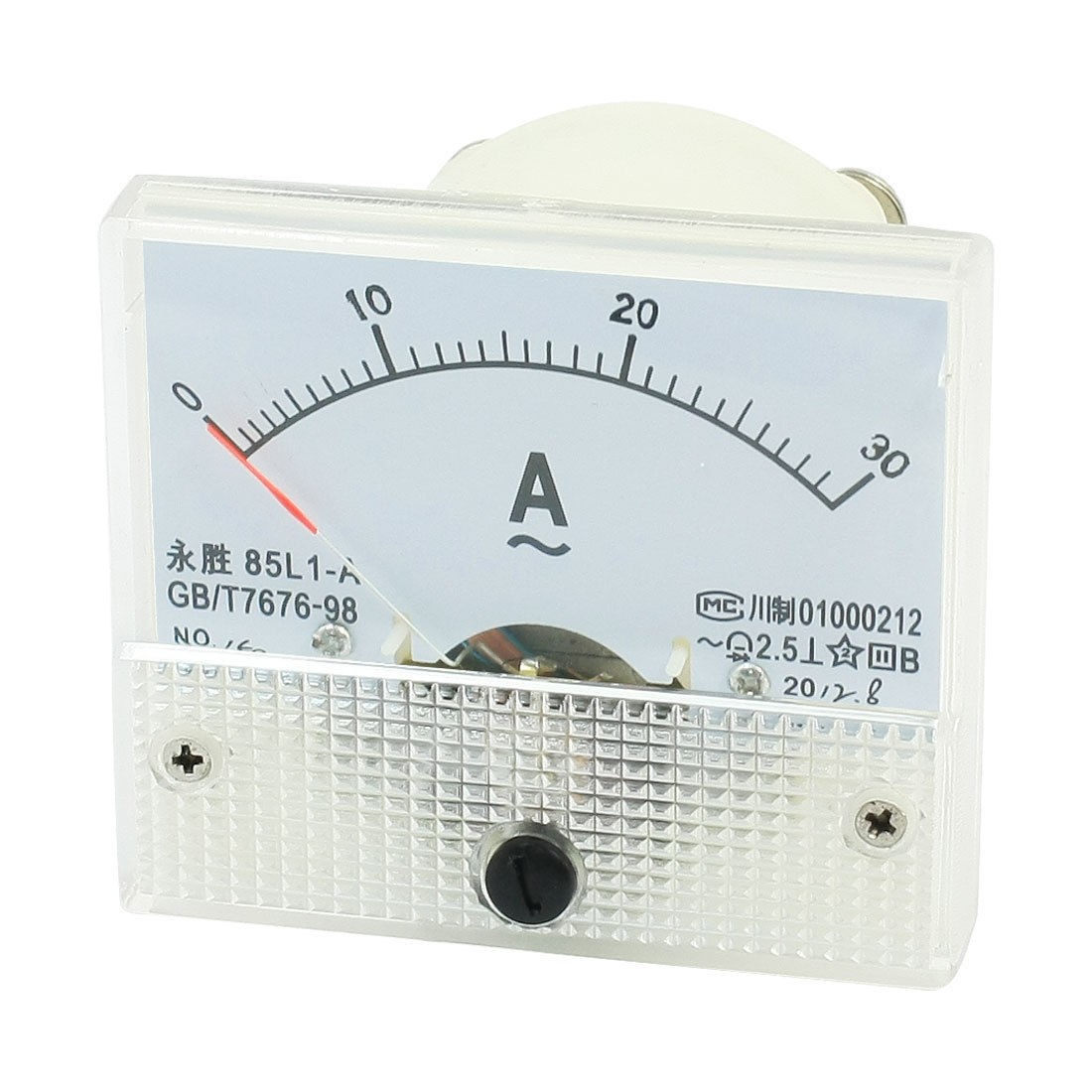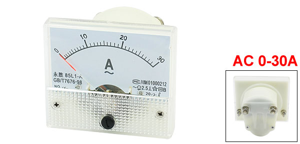Product Name Analog Ammeter Model No. 85L1-A Measuring Current Range AC 0-30A Accuracy Class 2.5 Meter Front Size(Approx.) 64 x 57 x 11mm / 2.5" x 2.2" x 0.43"(L*W*T) Thread Dia Big: 4mm / 0.16"