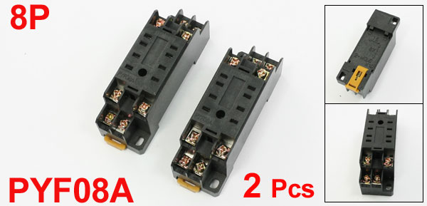 DetailsReplacement 8P Plug 3mm Din Rail Relay Socket Base PYF08A Pair for HH52P MY2  Product Name PYF08A Relay Base Model NO. PYF08A Pin Quantity 8 Total Size (Approx.) 7 x 2.3 x 3cm / 2.8" x 0.9" x 1.2" (L * W *T) Mounting Rail Width 3mm/0.12" Installing Hole Size 4mm/0.16" Installing Hole Spacing 6cm/2.4" Material Plastic, Metal Main Color Black Weight 55g Package Content 2 x PYF08A Relay Base