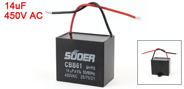 Terminal Wire Ambient Temperature 25/70/21 Rated Capacitance 14uF Tolerance +/-5% Rated Frequency 50/60Hz Rated Voltage 450V AC Body Size 5 x 3.5 x 3.8cm / 1.97" x 1.4" x 1.5" (L*W*H) Wire Length 9cm / 3.5" Install Bore Diameter 0.5cm / 0.197" Main Color Black, Red Weight 39g Package Content 1 x Motor Run Capacitor - Reviews
