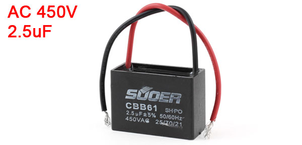 Terminal Wire Ambient Temperature 25/70/21 Rated Capacitance 2.5uF Tolerance +/- 5% Rated Frequency 50/60Hz Rated Voltage 450V AC Body Size 3.8 x 2.7 x 1.7cm / 1.5" x 1.1" x 0.7" (L*W*H) Wire Length 9cm / 3.5" Install Bore Diameter 0.5cm / 0.197" Main Color Black, Red Weight 19g Package Content 1 x Motor Run Capacitor - Reviews