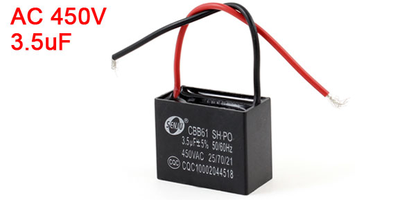 Terminal Wire Ambient Temperature 25/70/21 Rated Capacitance 3.5uF Tolerance +/- 5% Rated Frequency 50/60Hz Rated Voltage 450V AC Body Size 3.8 x 3.2 x 4.2cm / 1.5" x 1.3" x 1.7" (L*W*H) Wire Length 9cm / 3.5" Install Bore Diameter 0.5cm / 0.197" Main Color Black, Red Weight 39g Package Content 1 x Motor Run Capacitor - Reviews