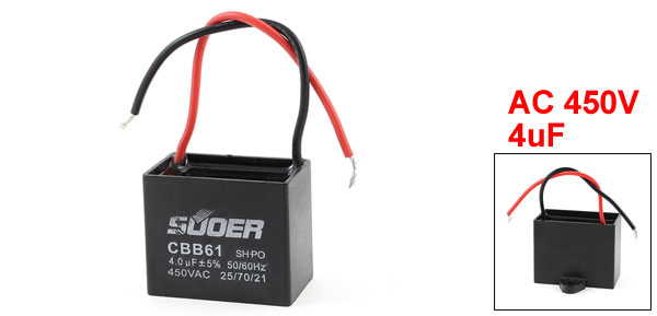 DetailsReplacement Ceiling Fan Motor Running Capacitor Black CBB61 450VAC 4uF 50/60Hz  Product Name Motor Capacitor Model CBB61 Dielectric Material Metallized Polypropylene Terminal Wire Ambient Temperature 25/70/21 Rated Capacitance 4uF Tolerance +/- 5% Rated Frequency 50/60Hz Rated Voltage 450V AC Body Size 3.8 x 3.2 x 4.2cm / 1.5" x 1.3" x 1.7" (L*W*H) Wire Length 9cm / 3.5" Install Bore Diameter 0.5cm / 0.197" Main Color Black, Red Weight 39g Package Content 1 x Motor Run Capacitor