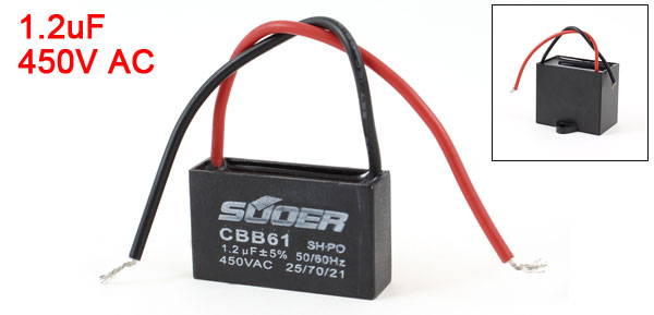 Terminal Wire Ambient Temperature 25/70/21 Rated Capacitance 1.2uF Tolerance +/- 5% Rated Frequency 50/60Hz Rated Voltage 450V AC Body Size 3.7 x 2.2 x 1.1cm / 1.5" x 0.9" x 0.4" (L*W*H) Wire Length 9cm / 3.5" Install Bore Diameter 0.5cm / 0.197" Main Color Black, Red Weight 19g Package Content 1 x Motor Run Capacitor - Reviews