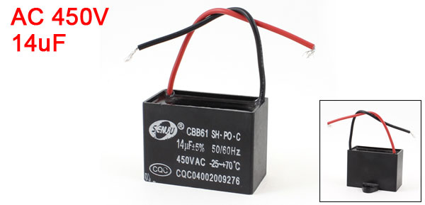 Terminal Wire Ambient Temperature 25/70 Rated Capacitance 14uF Tolerance +/- 5% Rated Frequency 50/60Hz Rated Voltage 450V AC Body Size 4.8 x 3.5 x 3.8cm / 1.9" x 1.4" x 1.5" (L*W*H) Wire Length 9cm / 3.5" Install Bore Diameter 0.5cm / 0.197" Main Color Black, Red Weight 39g Package Content 1 x Motor Run Capacitor - Reviews