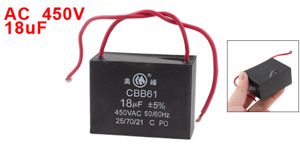 Terminal Wire Ambient Temperature 25/70/21 Rated Capacitance 18uF Tolerance +/-5% Rated Frequency 50/60Hz Rated Voltage 450V AC Body Size 5.8 x 4.4 x 2.8cm / 2.3" x 1.7" x 1.1" (L*W*H) Wire Length 13cm / 5.1" Install Bore Diameter 0.4cm / 0.16" Main Color Black, Red Weight 79g Package Content 1 x Motor Run Capacitor - Reviews