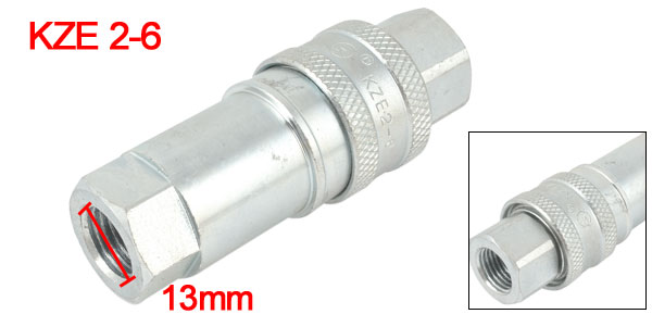 Product Name Quick Coupler Model KZE 2-6 Female Thread Diameter 13mm/ 1/4 PT Overall Size 72 x 27mm/ 2.8" x 1.1" (L*max.D) Color Silver Tone Material Metal Weight 167g Package 1 x Quick Coupler - Reviews