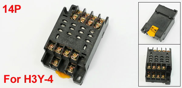 DetailsReplacement PYF14A 14P 35mm DIN Rail Relay Socket Base Stand for H3Y-4  Product Name Relay Socket Base Model PYF14A Fit for H3Y-4 Pin Number 14 Fixing Hole Size 5 x 4.2mm/0.197" x 0.165"(L*W) Installing Rail Size Standard 35mm Mounting Rail Total Size (Approx.) 75 x 45 x 30mm/2.9" x 1.8" x 1.2"(L*W*T) Main Color Black Material Plastic, Metal Weight 58g Package Content 1 x Relay Socket Base