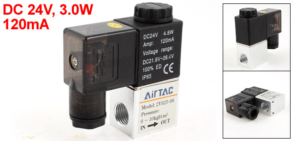 Type 2 Position 2 Way Power Consumption DC 24V, 3.0W Amp 120mA Voltage Range DC20.4V-26.4V Operating Pressure 0 - 10kgf/cm² Orifice Size(Approx) 2.5mm / 0.098" Port Size(Approx) PT 1/4 Hex Connector Inner Dia(Approx) 9.3cm / 0.366" Thread Hole Dia(Approx) 11.5mm / 0.453" Total Size (Approx) 5.9 x 2.2 x 6.7cm / 2.3" x 0.9" x 2.6" (L*W*H) Color White, Black Weight 132g Package Content 1 x Solenoid Valve - Reviews