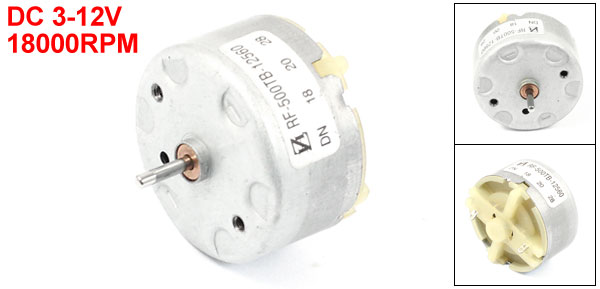 Product Name DC Motor Model RF-500TB-12560 Rated Voltage DC 3-12V Speed(no load) 18000RPM Body Size 33 x 24mm / 1.3" x 0.94"(D*H) Shaft Length 10mm/ 0.39" Total Length 35mm / 1.4" Main Color Silver Tone Material Metal Weight 61g Package 1 x DC Motor - Reviews