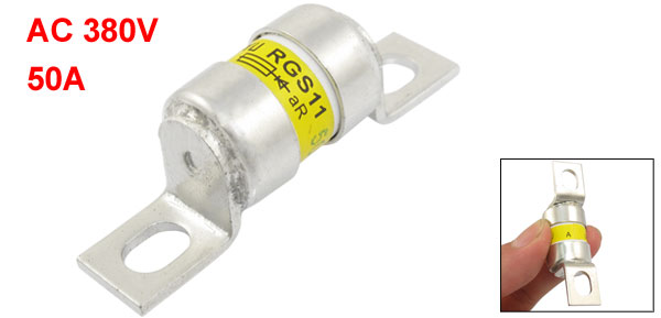 Product Name Bolt Connected Fuse Model RGS11 50A Type Fast Blow Rated Voltage AC 380V Rated Current 50A Total Size 5.6x 1.7cm/2.2" x 0.7"(L*Dia) Material Ceramic, Metal Main Color Yellow, White, Silver Tone Net Weight 22g Package Content 1 x Bolt Connected Fuse - Reviews