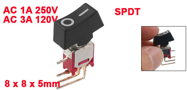 Product Name Rocker Switch Poles SPDT Terminals 4 Pin (On - On) Voltage AC 1A 250V AC 3A 120V Total Size 2.4 x 1.5 x 0.6cm/0.9'' x 0.87'' x 0.2'' (L*W*T) Mounting Dimension 8 x 8 x 5mm/0.31'' x 0.31'' x 0.2'' (L*W*Depth) Color Black, Red Material Plastic & Metal Total Weight 2g Package Content 1 x Rocker Switch - Reviews