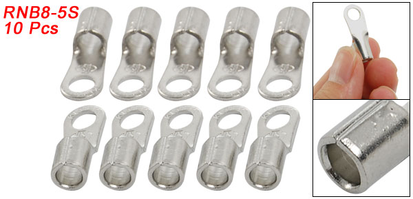 Product Name Non-Insulated Ring Terminal Ring Terminals Construction Non-Insulated Type RNB8-5S Design Ring Tongue Type Fit Cable Size 6-10mm2 (A.W.G 8 ) Max. Current 19A Ring Size 5 x 8.8mm / 0.196" x 0.346" (Inside Diameter*Outside Diameter) Tube Hole Size 4.2 x 7mm / 0.165" x 0.275"(Inside Diameter*Outside Diameter) Total Length 24mm / 0.944" Material Metal Color Silver Tone Weight 27g Package Content 10 Pcs x Non-Insulated Ring Terminal - Reviews