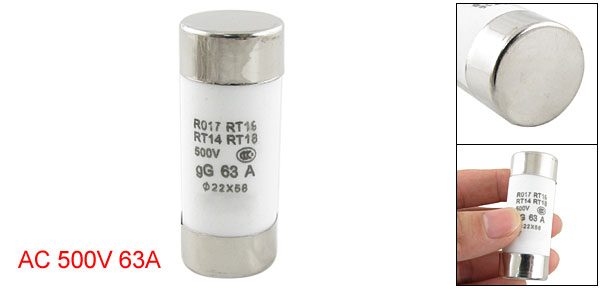 Product Name Cylindrical Fuse Link Model No. RO17 Material Metal, Ceramic, Electronic Parts Rated Voltage AC 500V Rated Current 63A Dimensions 22 x 58mm/0.87" x 2.28" (Dia*L) Main Color White, Silver Tone Weight 43g Package Content 1 x Cylindrical Fuse Link - Reviews