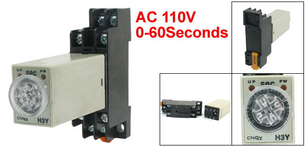 Product Name Time Relay Model Number H3Y-2 Control Voltage AC 110V Contact Resistive Load AC 250V 5A Contact Type DPDT, 2NO 2NC Number of Terminals 8 Pins Time Range 0-60Seconds Indicator Operation PW-Up Two LED Indicator Light External Material Plastic & Metal Total Size 72 x 22 x 87mm / 2.8" x 0.87" x 3.4"(L*W*H) Mounted Size 35mm DIN Rail Color As Picture Show Net Weight 74g Package Content 1 x Time Relay w PYF08A Base Socket
