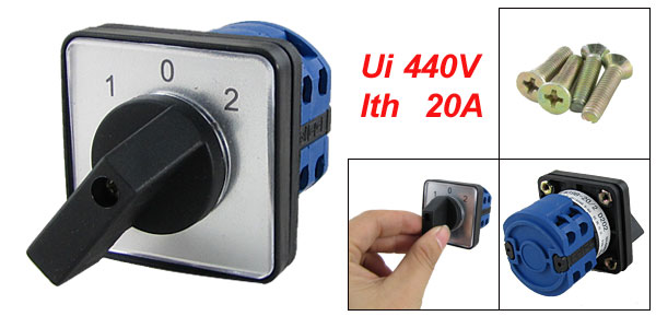 Product Name Changeover Cam Switch Model No. LW39B-20/2 Control Type 1-0-2 Posiotion Quantity 3 Terminals Quantity 8 Ui 440V Ith 20A Screw Hole Diameter 0.32cm/ 0.126" Mounting Hole Distance 3.62 x 3.62cm / 1.4" x 1.4" (L*W) Overall Size 4.8 x 4.8 x 7.2cm / 1.9" x1.9" x 2.8" (L*W*H) Mateiral Plastic, Electronics Color Black, Blue Net Weight 82g Package 1 x Changeover Cam Switch 4 x Screws - Reviews