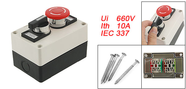 Product Name Push Button Station Ui 660V Ith 10A IEC 337 Contact Type Mushroom: 1 NC, 1 NO; Rotaty: 1 NC, 1 NO Material Plastic, Metal Button Size (Approx.) Mushroom Switch: 4 x 2.5cm/ 1.6" x 1"(D*H) Rotary Switch: 3.6 x 2.5cm/ 1.4" x 1"(Handle L* H) Box Size (Approx.) 10.8 x 7cm x 6.3cm/ 4.2'' x 2.7'' x 2.5'' (L*W*H) Mounting Screw Hole Dia.(Approx.) 5mm/ 0.2" Color Red, Black, White Net Weight 214g Package Content 1 x Push Button Station - Reviews