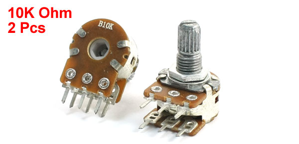 Product Name Dual Potentiometer Resistance Value 10K ohm Adjustment Type Top Adjustment Type Single Linear (Type B) Features Knurled Shaft Shaft Diameter 6mm / 0.2" Shaft Length 8mm / 0.3" Mounting Thread Diameter 7mm / 0.3" Base Size 17 x 9.3mm / 0.67" x 0.37"(D*H) Total Height 26mm/1.02" Material Metal, Electronic Parts Net Weight 16g Package 2 x Potentiometer - Reviews