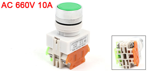 Product Name Push Button Switch Action Type Momentary Contact Type 1 NO, 1 NC Voltage 660V Ith 10A Terminals Quanlity 2 Pins Button Diameter 28mm/ 1.1" Cutter Thread Dia 25mm/1" Size 61 x 35 x 3mm/ 2.4" x 1.4" x 1.2" (L*W*H) Cap Color Green Material Plastic, Electric Parts Weight 35g Package Content 1 x Push Button Switch - Reviews
