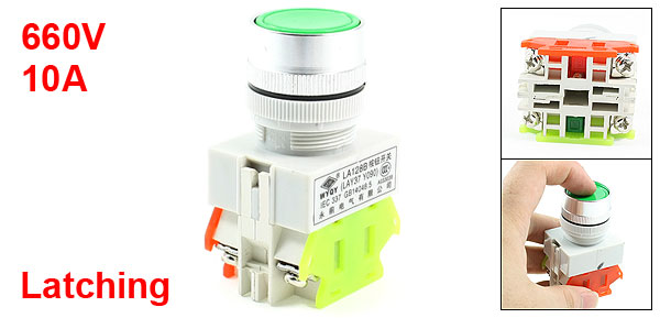 Product Name Push Button Switch Action Type Latching Contact Type 1 NO, 1 NC Ui 660V Ith 10A Terminals Quanlity 4 Pins Button Diameter 25mm/ 1" Size 65 x 35 x 3mm/ 2.6" x 1.4" x 1.2" (L*W*H) Cap Color Green Material Plastic, Electric Parts Weight 43g Package Content 1 x Push Button Switch - Reviews