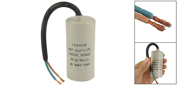 Product Name Motor Capacitor Housing Material Plastic Dielectric Material Polypropylene Model CBB60 Capacitance 12uF Tolerance ±5% Rated Voltage 450V AC Frequency 50Hz Body Size 3.4 x 7.2cm / 1.33" x 2.83" (D * H) Wire Size(Approx.) 14.5 x 0.6cm / 5.7" x 0.23" (L * Max.D) Color As Picture Shown Weight 60g Package Content 1 x Motor Capacitor - Reviews