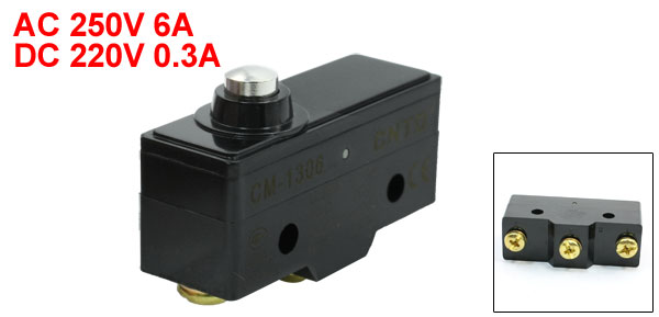 Product Name Micro Limit Switch Model No. CM-1306 Actuator Action Momentary Actuator Type Round Push Plunger Rating Voltage & Current AC 250V 6A