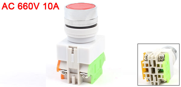 Product Name Push Button Switch Action Type Momentary Contact Type 1 NO, 1 NC Voltage 660V Ith 10A Terminals Quanlity 2 Pins Button Diameter 28mm/ 1.1" Cutter Thread Dia 25mm/1" Size 61 x 35 x 3mm/ 2.4" x 1.4" x 1.2" (L*W*H) Cap Color Red Material Plastic, Electric Parts Weight 35g Package Content 1 x Push Button Switch - Reviews