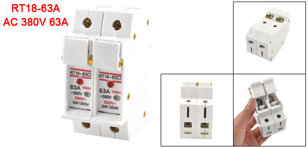 Product Name Fuse Holder Type RT18-63A Fit Fuse Type 14x51mm (Not Included Here) Rated Insulation Voltage 500V Rated Voltage AC 380V Rated Current 63A Poles Quantity 2 Material Hard Plastic, Metal Color White Overall Size(Approx) 10.5 x 8 x 5cm / 4.1" x 3.1" x 2"(L*W*H)