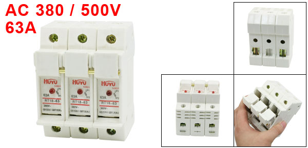 Product Name Fuse Holder Type RT18-63A Fit Fuse Type 14 x 51mm / 0.551" x 2.008"(D*H)(Not Included Here) Rated Voltage AC 380 / 500V Rated Current 63A Poles Quantity 3P Material Hard Plastic & Metal Color See the Picture Overall Size(Approx) 10.2 x 7.5 x 7.8cm / 4" x 3" x 3.1"(L*W*H)