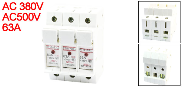 Product Name Fuse Holder Type RT18-63A Fit Fuse Type 10 x 38mm / 0.4" x 1.5"(D*H)(Included Here) Rated Insulation Voltage AC500V Rated Voltage AC 380V Rated Current 63A Poles Quantity 3P Material Hard Plastic, Metal Color White Mounting Type 35mm DIN Rail Overall Size(Approx) 78 x 71 x 103mm / 3.1" x 2.8" x 4"(L*W*H)