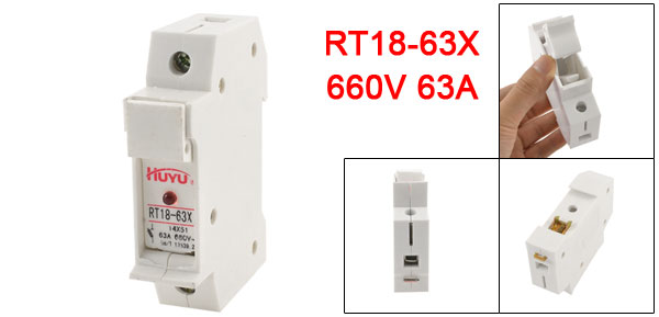 Product Name Fuse Holder Type RT18-63X Fit Fuse Type 14x51mm (Not Included Here) Rated Voltage AC 660V Rated Current 63A Poles Quantity 1 Material Hard Plastic, Metal Color White Overall Size(Approx) 10 x 7.5 x 2.5cm / 4" x 3" x 1"(L*W*H)