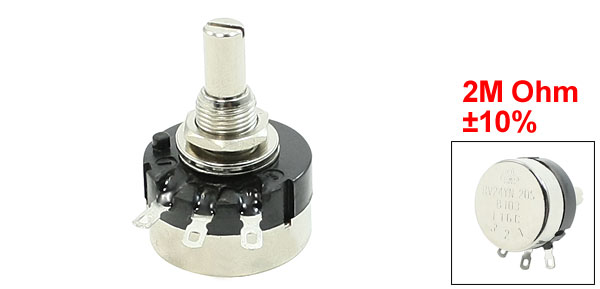 DetailsRV24YN 20S 2M Ohm 10% 0.25W Rotary Carbon Film Potentiometer  Product Name Potentiometer Model RV24YN 20S Type Rotary Shaft Material Carbon Film Rated Power 0.25W Resistance Value 2M Ohm Resistance Tolerance ±10% Knob Shaft Dia 6mm / 0.24" Thread Diameter 9mm / 0.35" Total Size(Leads not included) 24 x 35mm/ 0.9" x 1.4" (Max D*H) Weight 22g Package 1 x Potentiometer