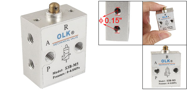 Product Name Mechanical Valve Model S3B-M5 Button Type Basic without Button Control Type Extenal Control Medium 40 Micron Filtered Air Position and Way No. 2 / 3 Fit Pipe Size M5 Port Size 3.8mm/0.15" Install Thread Diameter 3.8mm/0.15" Mounting Hole Distance 18mm/ 0.78" Operating Temperature Range