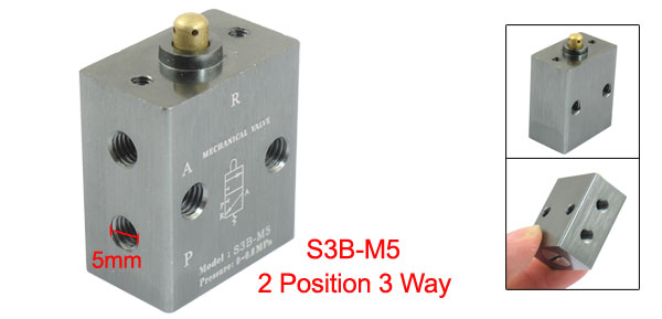 DetailsS3B-M5 Two Position 3 Way 5mm Thread Hole Pneumatic Mechanical valve  Product Name Mechanical Valve Model S3B-M5 Button Type Basic without Button Operation Type Direct Acting Control Type Extenal Control Medium 40 Micron Filtered Air Position and Way No. 2 / 3 Hole Size 5mm Install Thread Diameter 2.5mm/0.1" Mounting Hole Distance 18mm/0.78" Operating Temperature Range -5~60°C Working Pressure Range 0 ~ 0.8Mpa Lubrication Not Required Total Size(Approx.) 36 x 26 x 16mm/1.42" x 1.02" x 0.63"(L*W*H) Color Black Material Metal Weight 32g Package 1 x Mechanical Valve