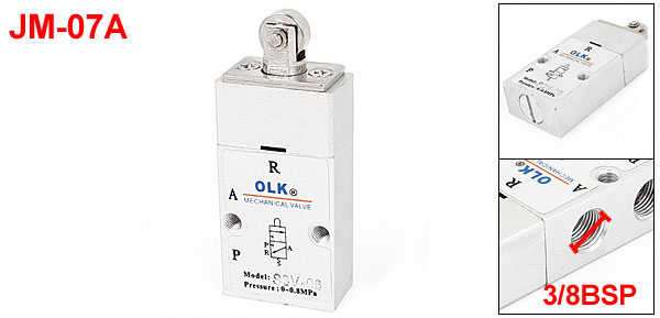 Product Name Mechanical Valve Model JM-07A Button Type Roller Operating Temperature Range -5~60 Celsius Degree Contact Type External Control Port Type 3 Position Type 2 Pipe Thread Diameter 8mm/3/8BSP,4.2mm/1/8BSP Working Pressure Range 0 to 0.8MPa Roller Dia. 11.5mm/0.45" Total Size(Approx) 7.3 x 3 x 1.5cm/2.9"x 1.2" x 0.6"(L*W*H) Main Color Silver Tone Material Alloy Net Weight 91g Package Content 1 x Mechanical Valve - Reviews