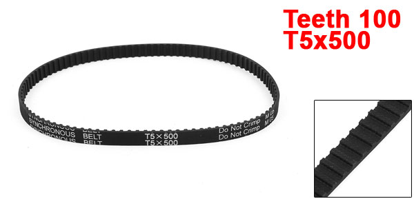 Product Name Timing Belt Model T5x500 Number of Teeth 100 Teeth Pitch 5mm / 0.2" Belt Width 10mm / 0.4" Belt Girth 500mm/ 19.7" Material Rubber Color Black Weight 16g Package Content 1 x Timing Belt - Reviews