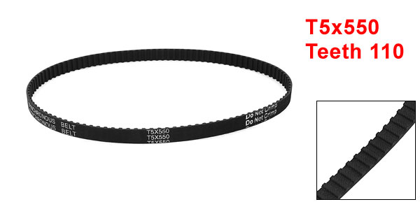 Product Name Timing Belt Model T5x550 Number of Teeth 110 Teeth Pitch 5mm / 0.2" Belt Width 10mm / 0.4" Belt Girth 550mm/ 21.7" Material Rubber Color Black Weight 9g Package Content 1 x Timing Belt - Reviews