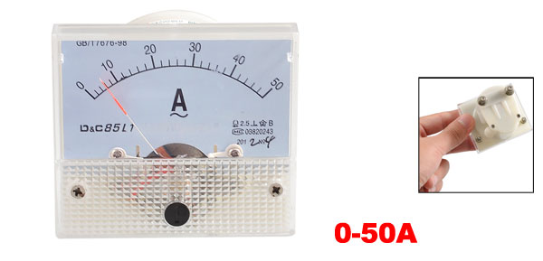 Product Name Ampere Panel Meter Scale Range 0-50A Accuracy Class 2.5 Material Plastic Color White, Clear, Beige Back Screw Dia. 3.8 mm / 0.15" & 2.8 mm / 0.11" Panel Size 6.3 x 5.5 x 1.1 cm / 2.5" x 2.2" x 0.4" (L*W*T) Overall Depth 6 cm / 2.36" Weight 95g Package Content 1 x AC Ampere Panel Meter - Reviews