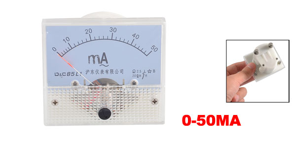 Product Name Milliampere Panel Meter Scale Range 0-50MA Accuracy Class 2.5 Material Plastic Color White, Clear, Beige Back Screw Dia. 3.8 mm / 0.15" & 2.8 mm / 0.11" Panel Size 6.3 x 5.5 x 1.1 cm / 2.5" x 2.2" x 0.4" (L*W*T) Overall Depth 6 cm / 2.36" Weight 97g Package Content 1 x AC Milliampere Panel Meter - Reviews
